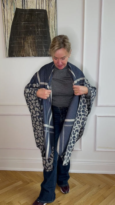 Elegant poncho i sort med grå/blå grafiske striber og leopardkant. Vævet i en blød, let kvalitet med 80% viscose for flot fald og 20% uld for naturlig varme. One size – nem at kaste over en skjorte eller jakke, når du vil have et stilfuldt, varmt lag året rundt.