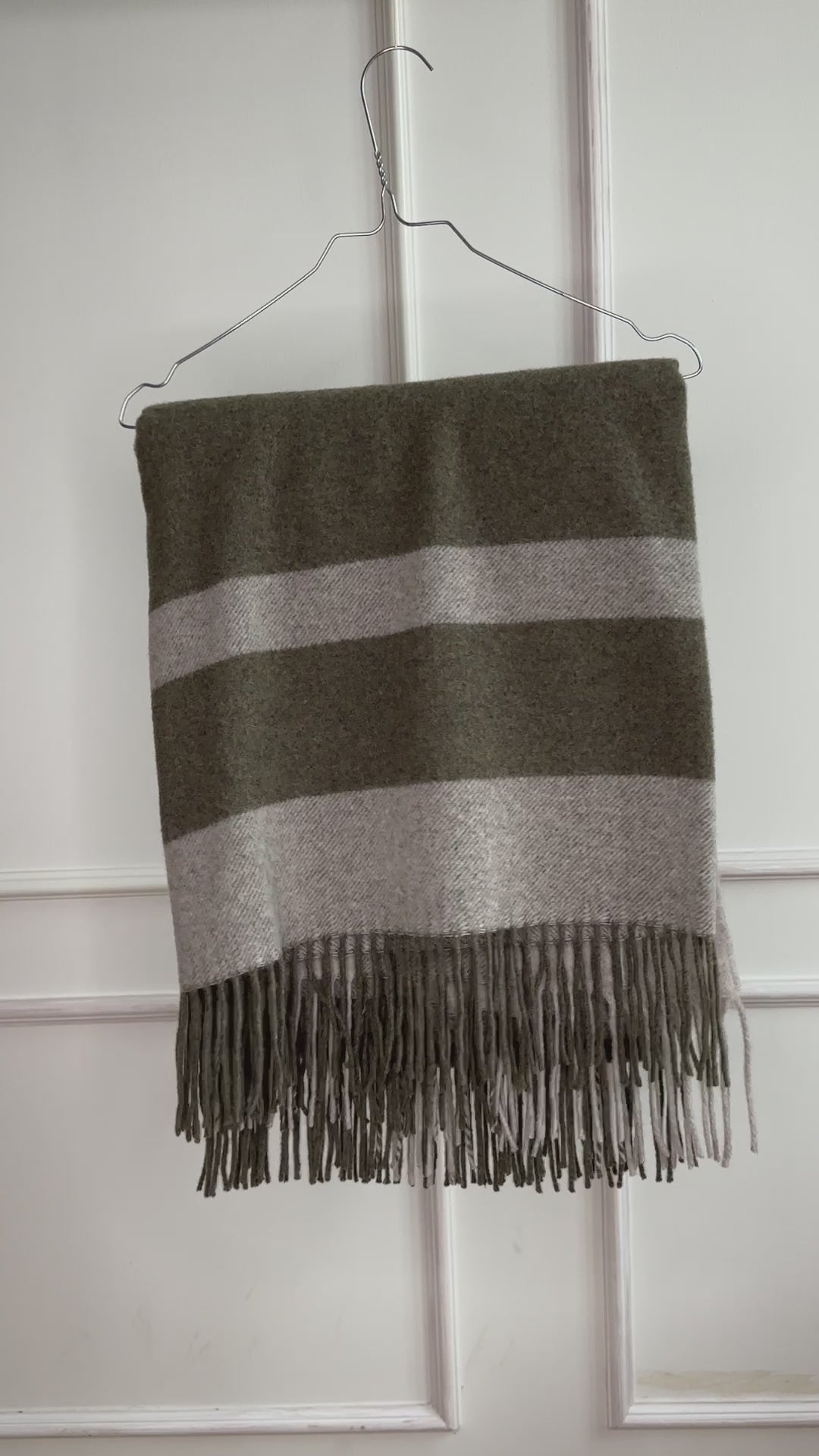 Eksklusiv uldplaid i oliven/grå med klassiske vinduestern. Vævet i en blød luksusblanding af 10% cashmere og 90% merinould, som giver ekstra blødhed, fin glans og naturlig temperaturregulering. De lyse tern og de offwhite frynser giver et roligt, nordisk udtryk til sofa eller seng. Fremstillet af OEKO-TEX® STANDARD 100 certificeret materiale.