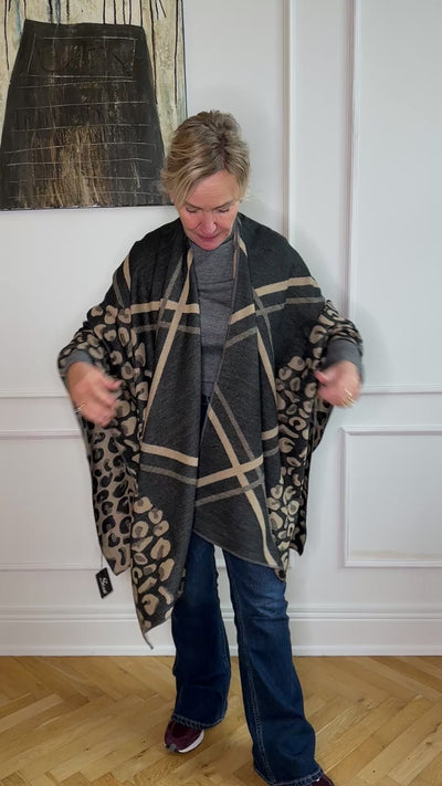 Elegant poncho in black with beige/black graphic stripes and leopard trim . Woven in a soft, lightweight quality with 80% viscose for a nice drape and 20% wool for natural warmth. One size – easy to throw over a shirt or jacket when you want a stylish, warm layer all year round.
