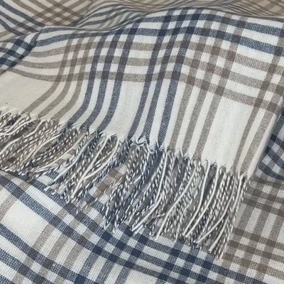 Den smukke off white farve med blå og beige tern tilfører et moderne og elegant udseende til ethvert rum og passer harmonisk til en lang række indretningsstile. Uanset om det er til at kaste over sofaen, bruge som et lunende tæppe eller blot som en dekorativ tilføjelse til dit hjem, vil dette plaid give dit rum et tidssvarende præg.