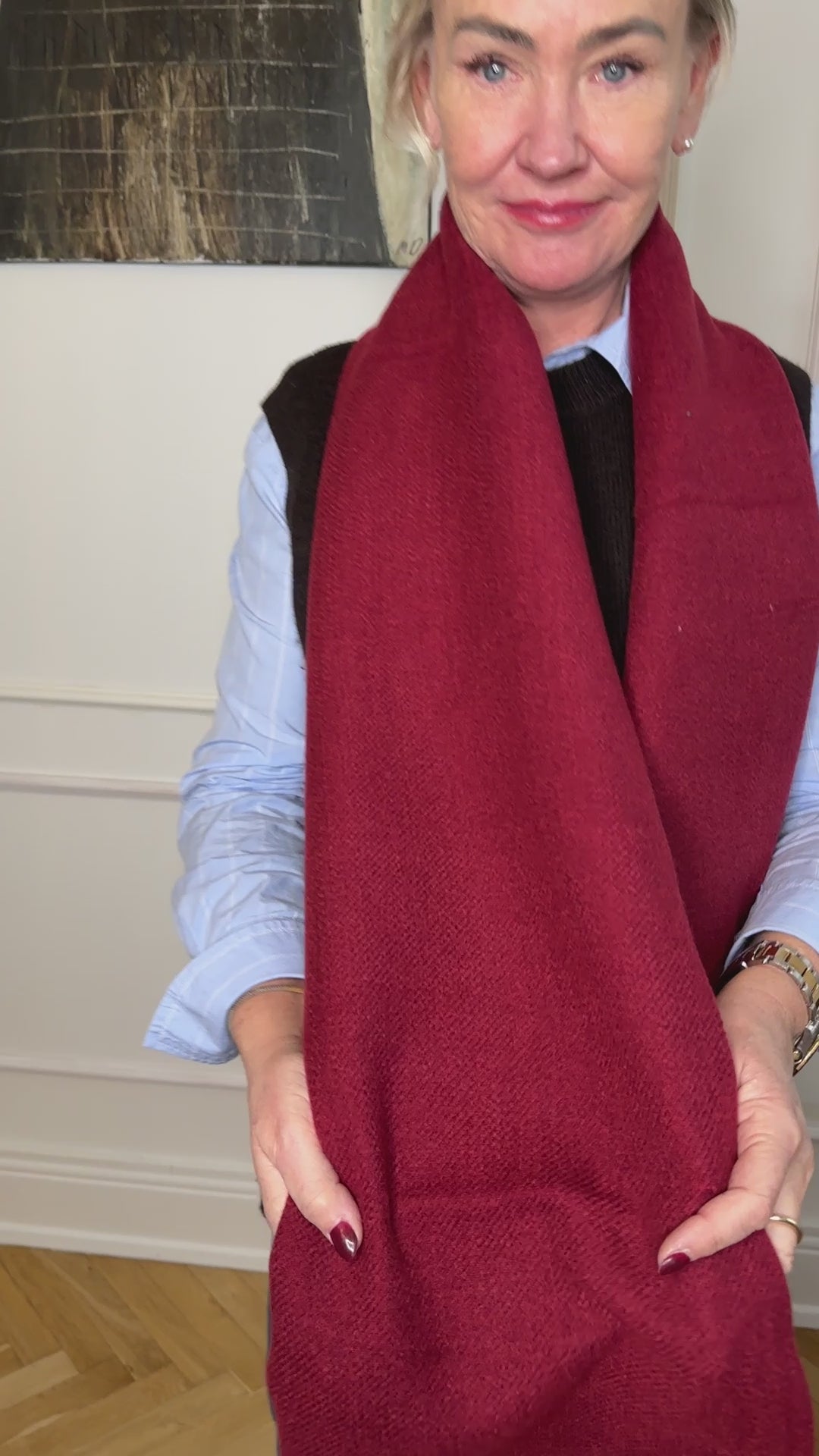 Blødt og let sjal i elegant bordeaux/rød med vendbart udtryk og fine frynser. Vævet i en behagelig blanding af 20% uld for naturlig varme og 80% viscose for et smidigt, kradsefrit fald. Perfekt som lun skuldervarmer til hverdagsbrug, rejser og kølige aftener – året rundt.