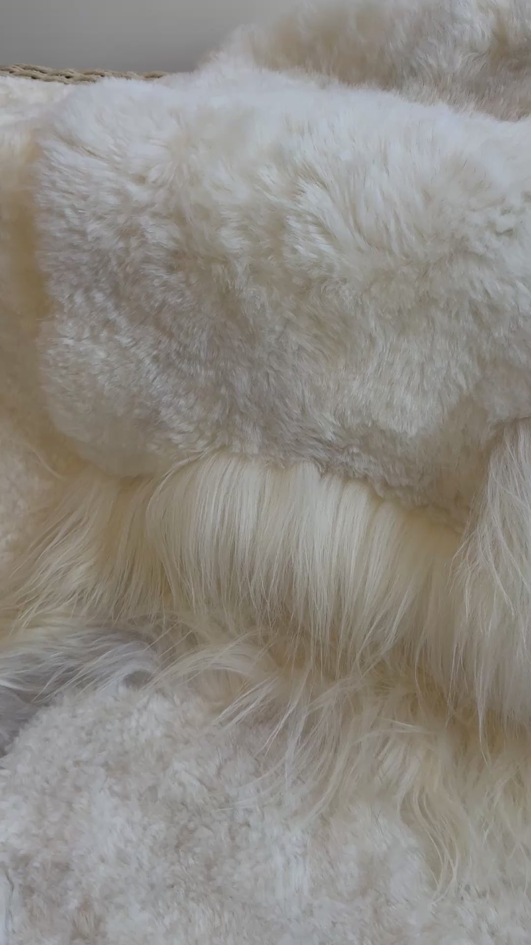 Dette lammeskindstæppe er en unik og luksuriøs tilføjelse til ethvert hjem. Tæppet er lavet af langhårede og afklippede hvide, grå og brune islandske lammeskind sat sammen til ét stort meleret farvetæppe på cirka 180x120 cm. Sammensætningen af forskellige naturlige nuancer og teksturer skaber et smukt design, der gør hvert tæppe helt unikt.