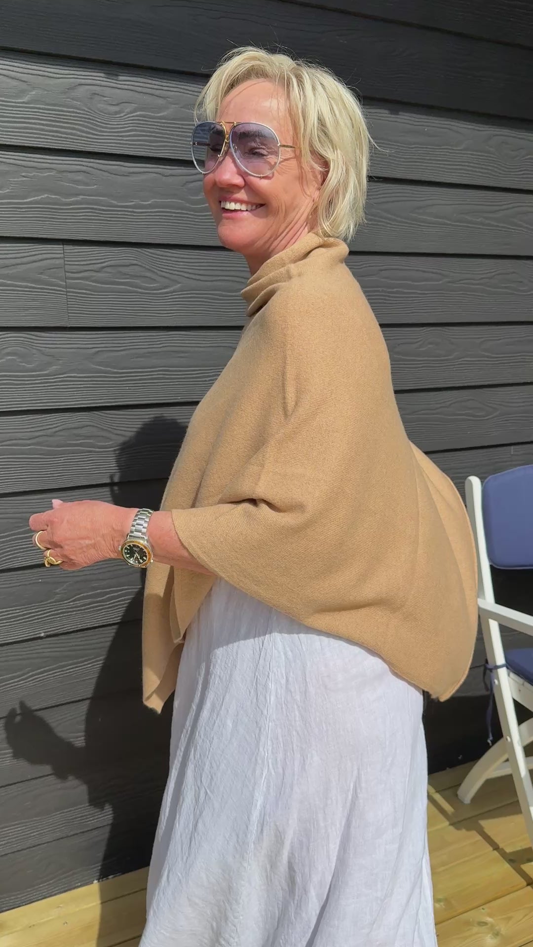 Denne poncho i 100% cashmere er den ultimative kombination af luksus og komfort. Med sit bløde, lette og åndbare materiale giver den en uforlignelig følelse af velvære, samtidig med at den holder dig varm på kølige dage. Ponchoens enkle og tidløse design gør den alsidig og let at style til både hverdag og særlige anledninger. Den kan bæres over en skjorte, sweater eller endda som en sofistikeret tilføjelse til en aftenudflugt. Cashmerens naturlige glans og struktur giver ponchoen et eksklusivt udtryk, der nemt kan opgradere enhver garderobe med et touch af elegance.
