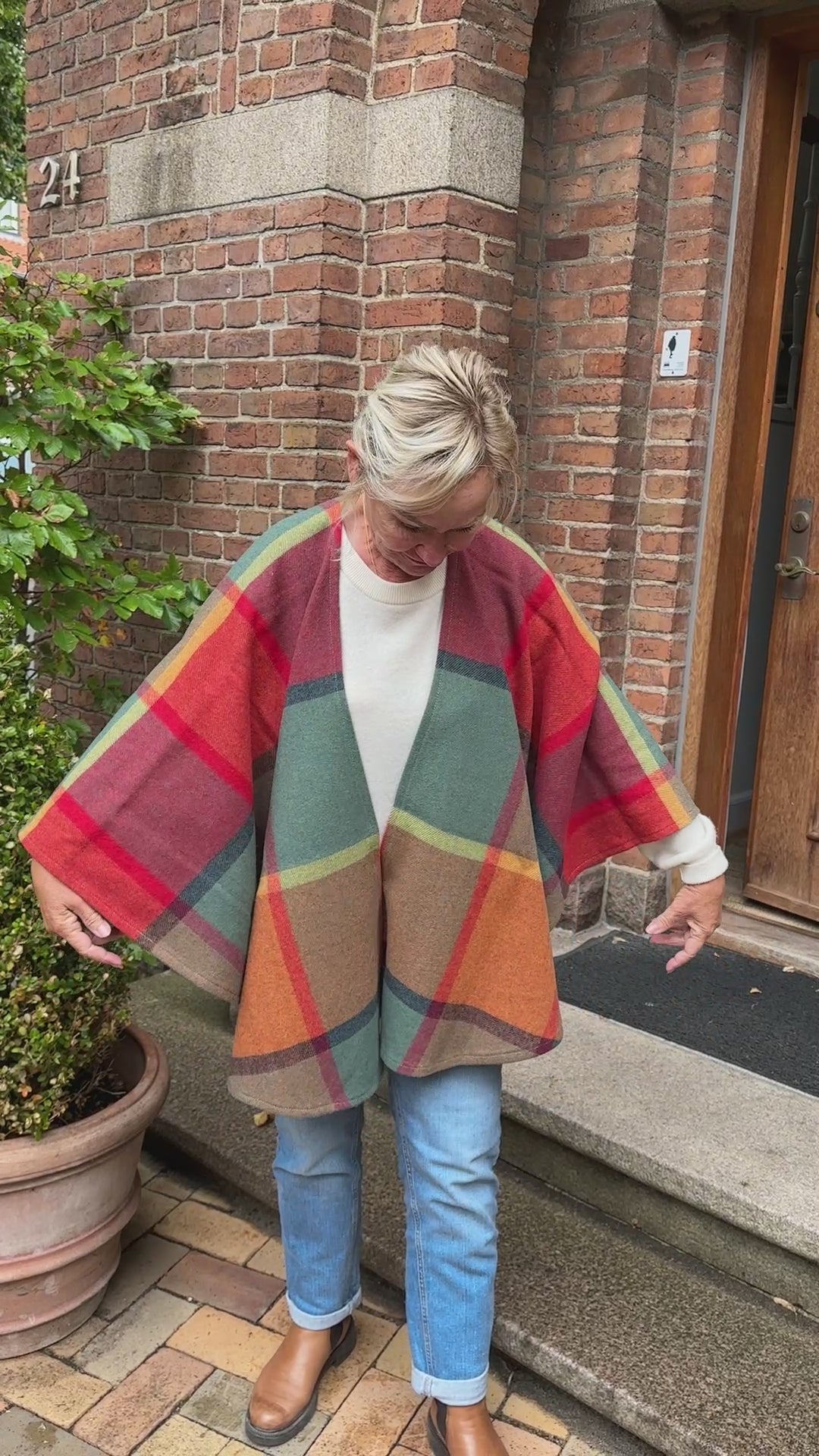 Poncho i lammeuld - Orange og grøn m. tern (137x180 cm)