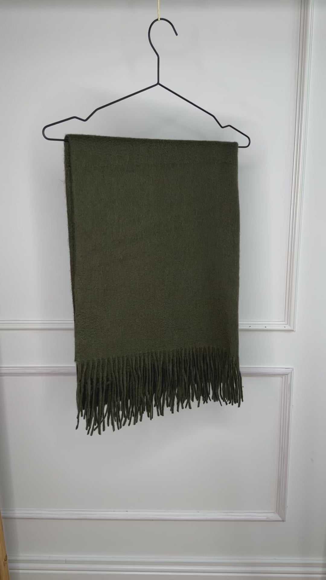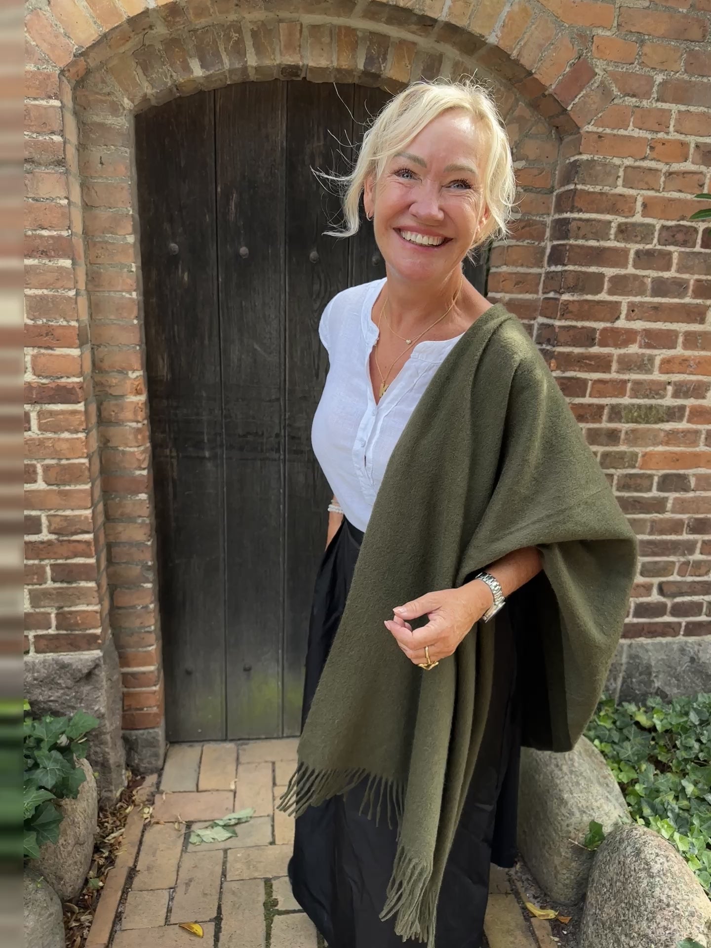 Stilfuldt og elegant damesjal med frynser i khakigrøn. Vores sjaler i 100% Cashmere er lavet af den fineste kvalitet Cashmere uld, som er kendt for sin blødhed, varmeevne og åndbarhed. Cashmere er en type uld, som er opnået fra Cashmere geden, og er kendt for at være en af de blødeste og mest luksuriøse typer af uld.