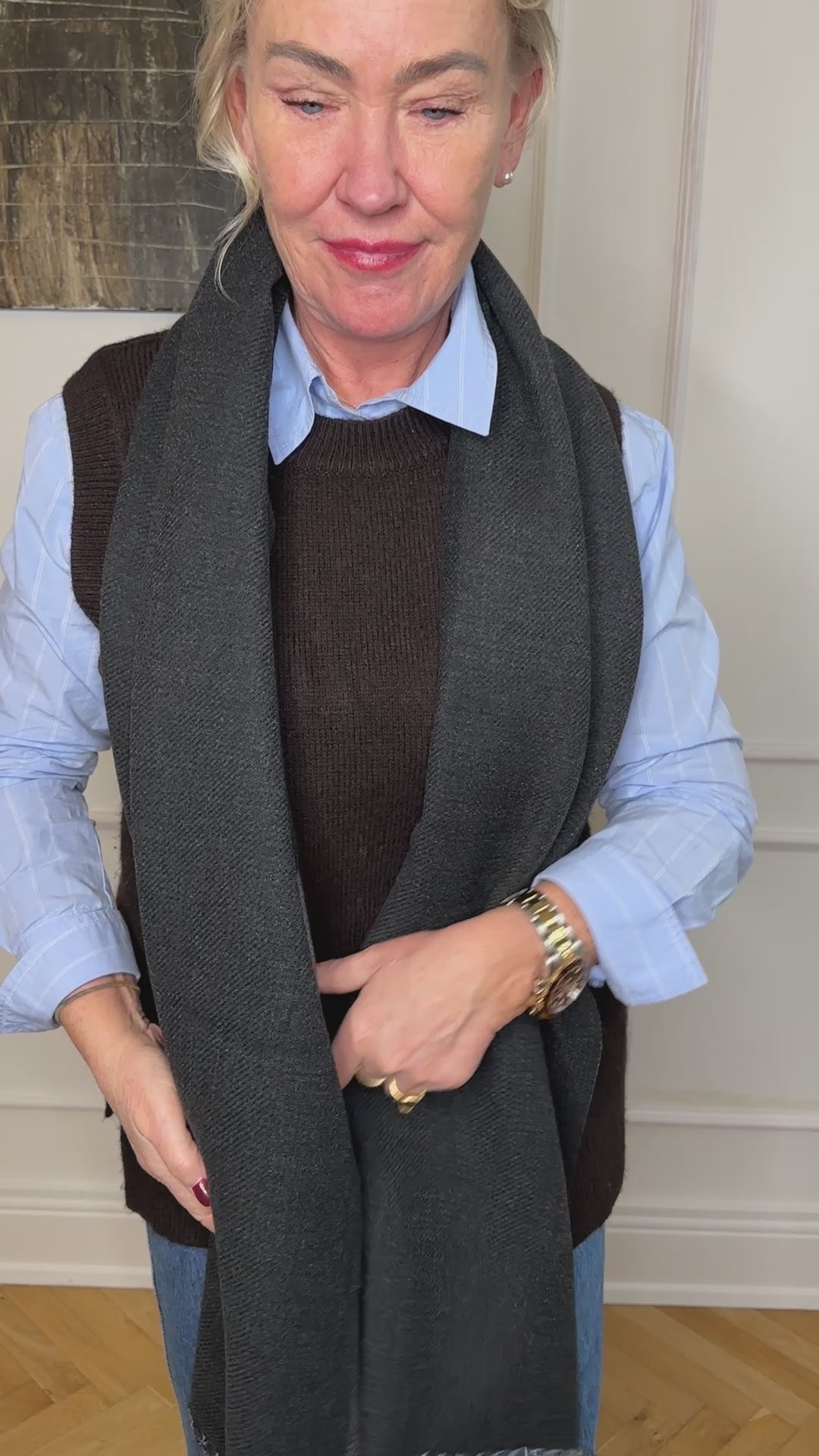 Blødt og let sjal i elegant Grå/lysegrå med vendbart udtryk og fine frynser. Vævet i en behagelig blanding af 20% uld for naturlig varme og 80% viscose for et smidigt, kradsefrit fald. Perfekt som lun skuldervarmer til hverdagsbrug, rejser og kølige aftener – året rundt.