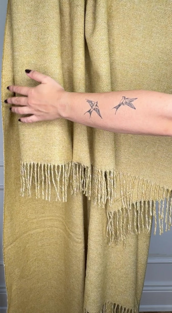 Uldplaiden har designet og fået produceret denne flotte plaid i 80% merinould i en gul mustard farve. Ulden stammer fra Italien og er af den højeste kvalitet. Produkter af denne slags merinould tilpasser sig ens kropstemperatur og holder på godt varmen.